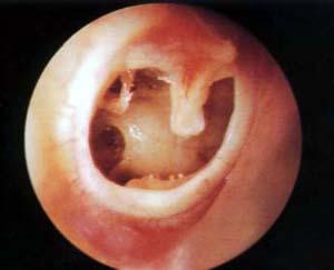 图为:胆脂瘤型中耳炎导致的鼓膜穿孔
